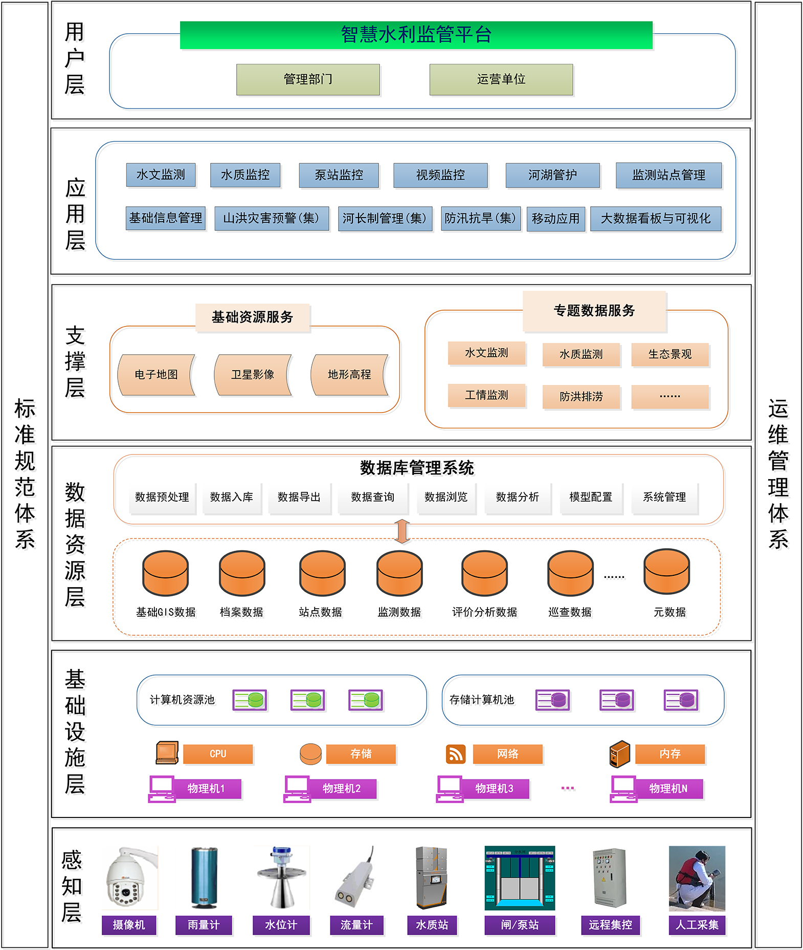 智慧感知層:用于水雨情、旱情、工情、水質(zhì)、監(jiān)控視頻等的前端自動監(jiān)測設(shè)備,是平臺業(yè)務(wù)數(shù)據(jù)信息的主要來源。