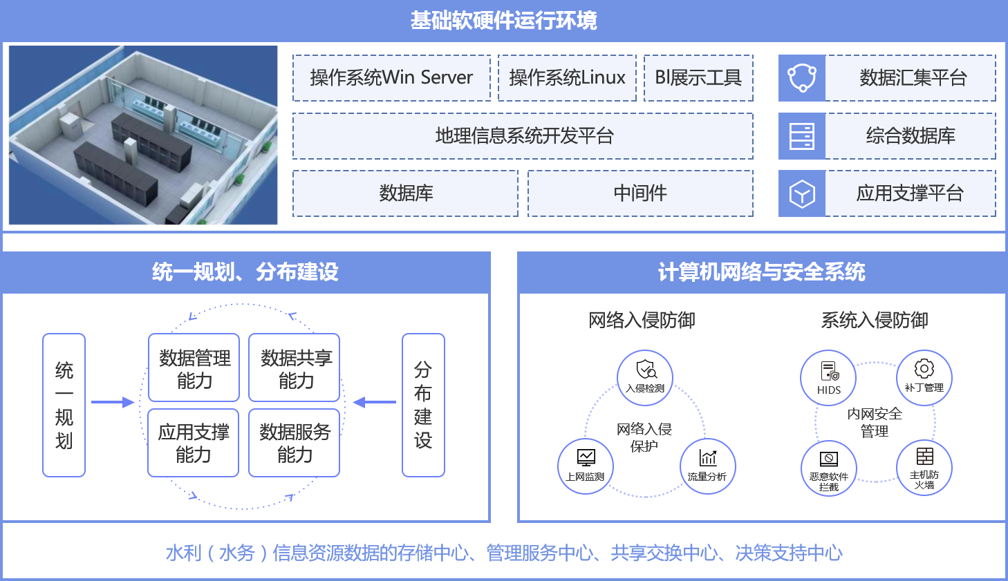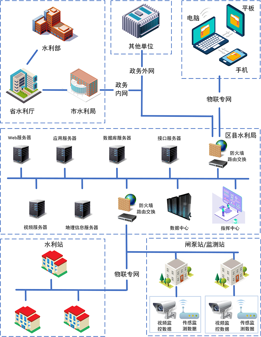 一中心:建立支撐新一代水利業(yè)務(wù)應(yīng)用的指揮調(diào)度中心,包括大數(shù)據(jù)中心、指揮控制大廳、指揮調(diào)度系統(tǒng)、會議系統(tǒng)和信息發(fā)布系統(tǒng)。